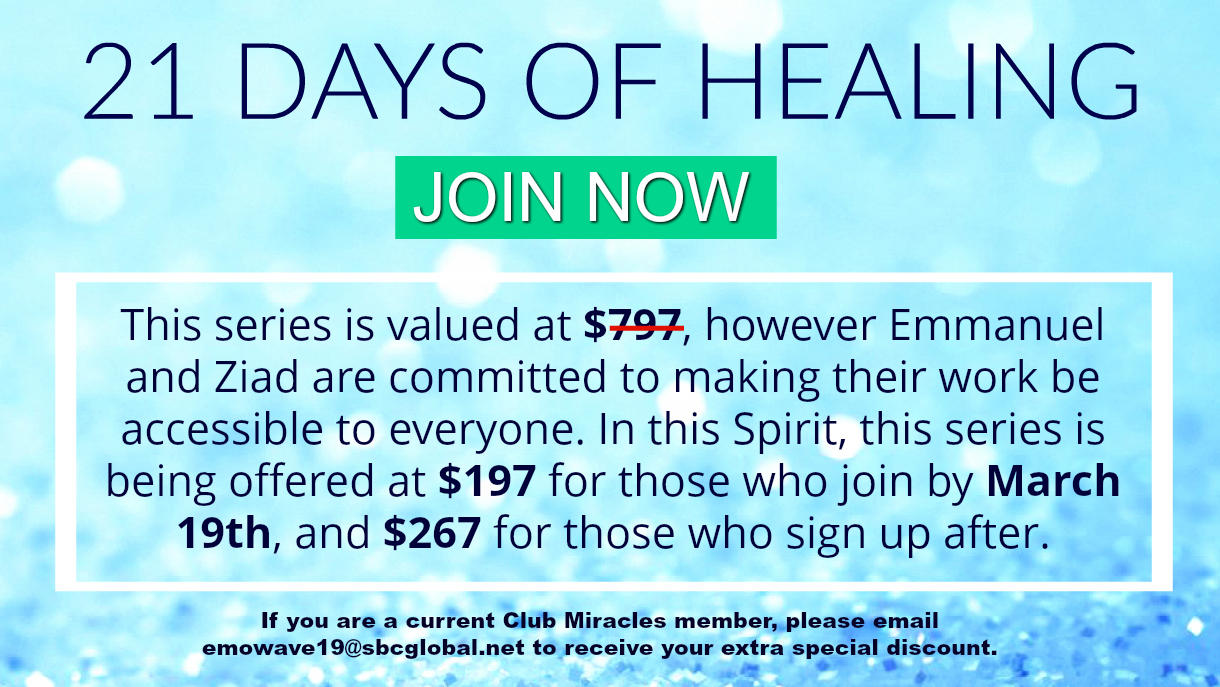 If you are a current Club Miracles member (a monthly healing service Emmanuel and Ziad offer) or if you were part of the last 21 days of healing series, please email Emmanuel to receive your special discounted rate at emowave19@sbcglobal.net